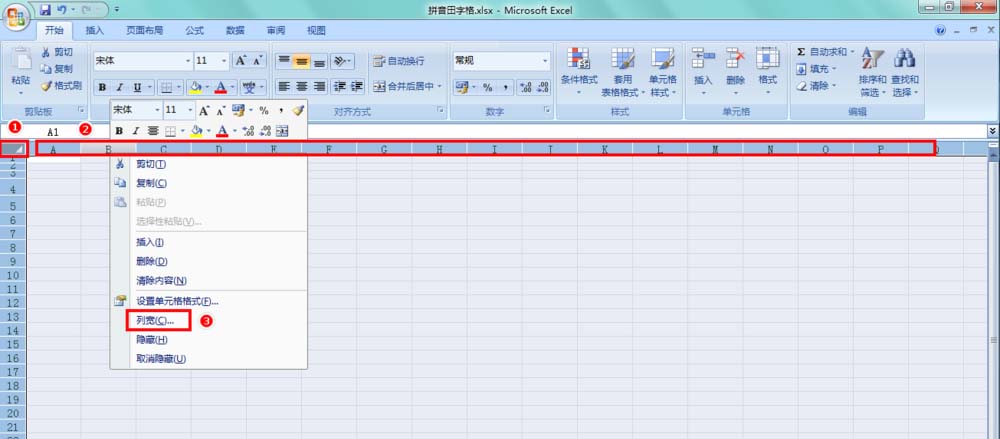 3、点击表格区域左上角的方块,作用是全选表格,然后鼠标右键列序号行的任意位置,设置列宽为“2.5”;