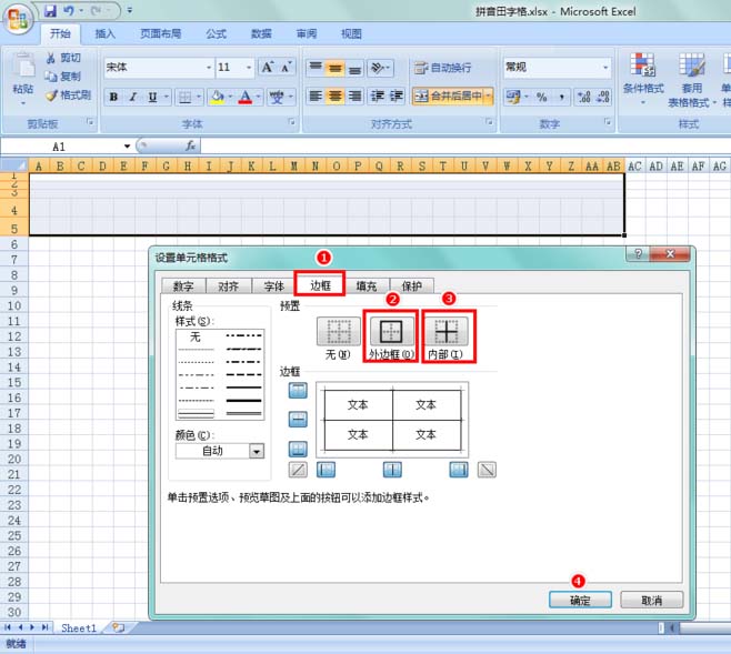 5、下面选择1到5行,A到AB列的区域,鼠标右键设置单元格格式,点击“边框”标签页,预置选择“外边框”和“内部”,确认,设置结束,一行拼音加田字格的效果就出来了;