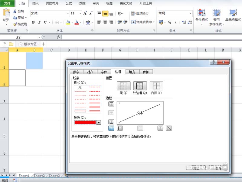 5、同样方法选择a2和b2两个单元格,调出设置单元格对话框,设置下边框,颜色为红色。