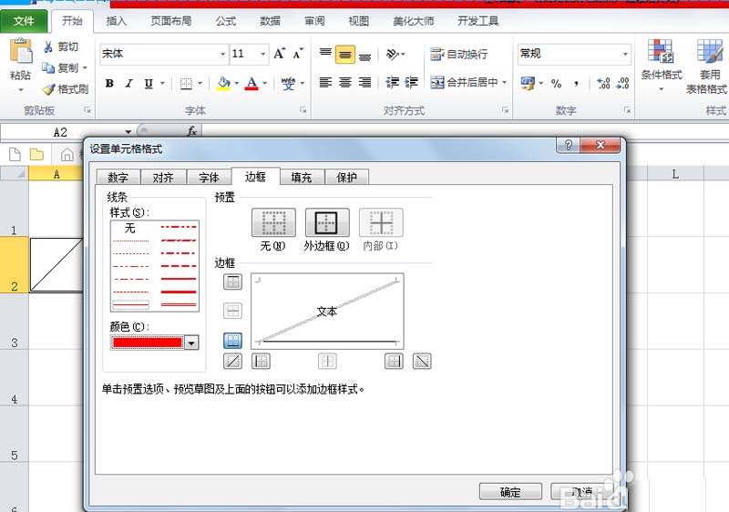 4、在单元格格式对话框中,切换到边框选项卡,设置左下到右上边框,颜色为红色。