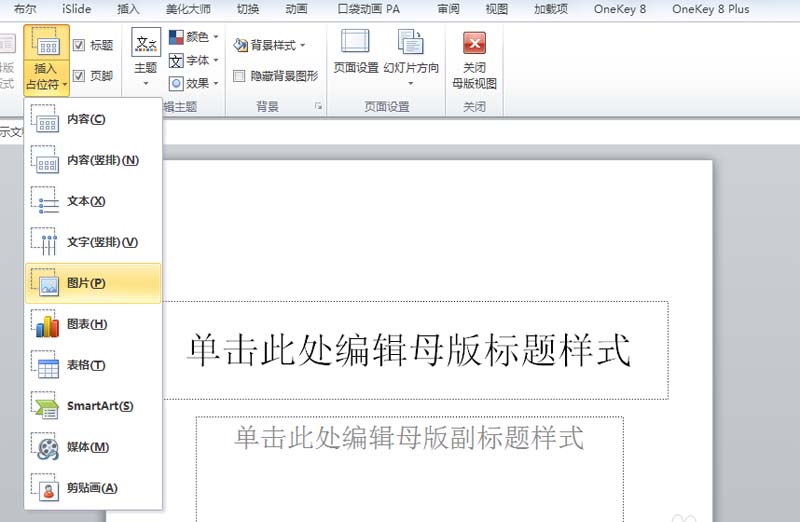 3、接着点击插入占位符右下角的下拉三角,选择图片选项。