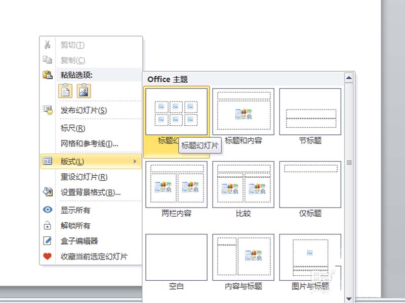 5、点击关闭母版视图,右键单击从下拉菜单中选择版式,并选择刚才编辑的版式。