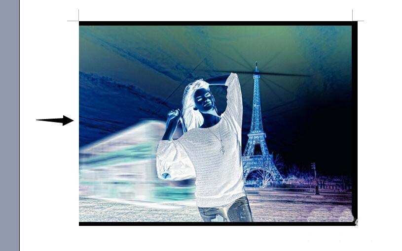 2、在图片的左边空白位置处(图中的箭头所示位置),单击鼠标左键。我们发现,照片被选中了。而且,现在照片已经就是底片(反相)效果了。