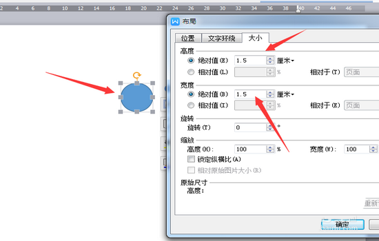 3、设置这个【圆形】的大小。设置高度、宽度的绝对值均为【1】,设置的方法前面都介绍过,这里就不重复了。