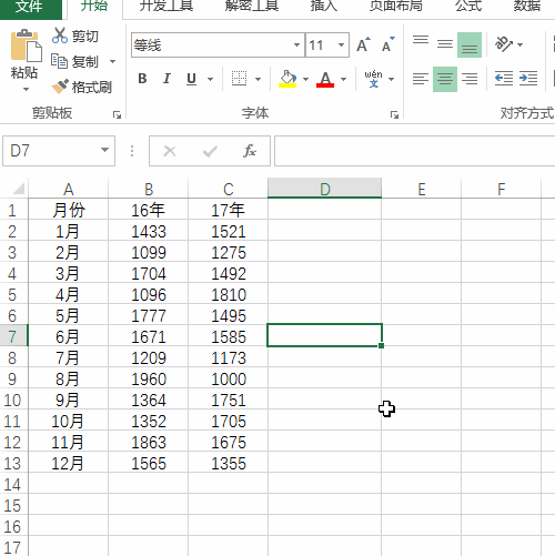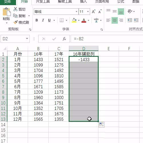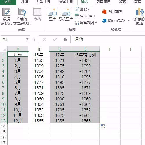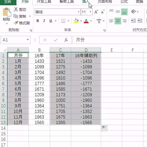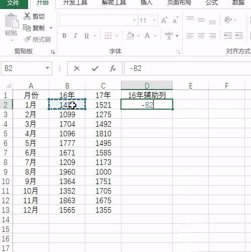 1、打开excel表格,首先呢是要插入一列16年的辅助列,注意直接用减号减去就行了