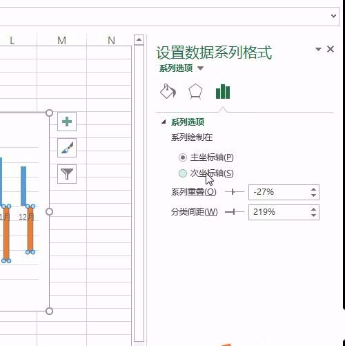 3、显示了图表之后呢,首先双击某个图例元素,打开右侧的格式设置,首先选中下面的柱形图,然后选择格式设置中的次坐标轴格式