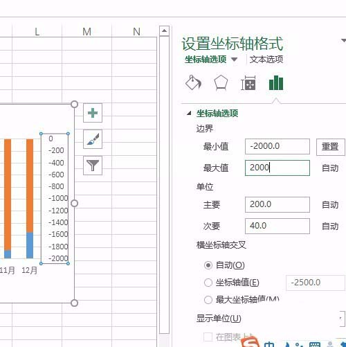 4、接着选中主次纵坐标,修改区间均为-2000到2000