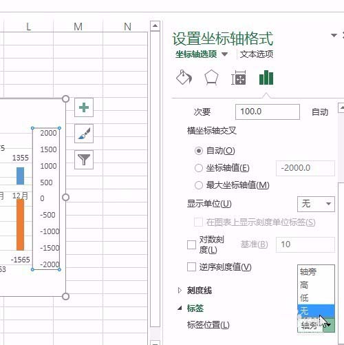 6、接着选中主次纵坐标,修改标签位置为无