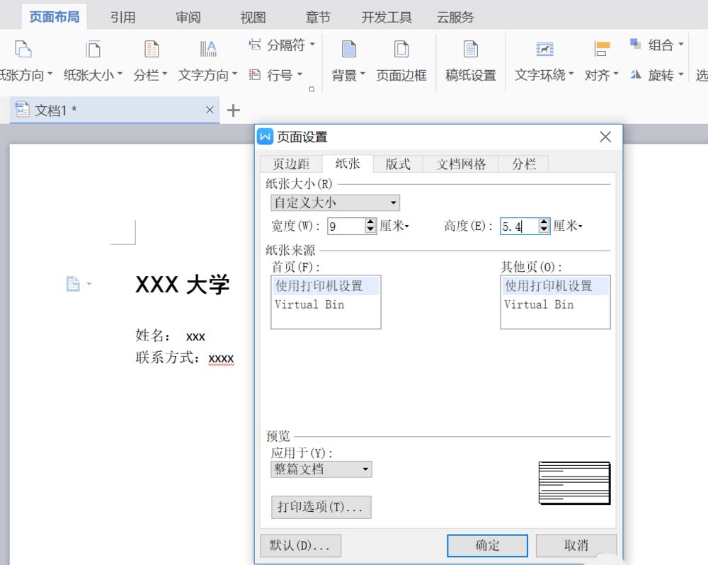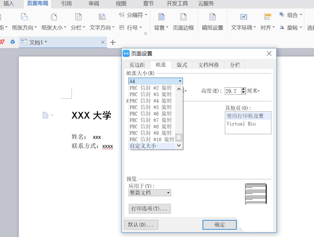 5、切换到纸张选项,将纸张大小设置为自定义大小。如图。