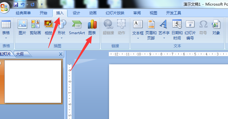 1、打开ppt,把幻灯片版式设置成空白的,然后点击插入,选择图表。