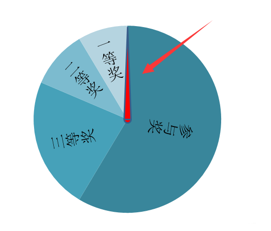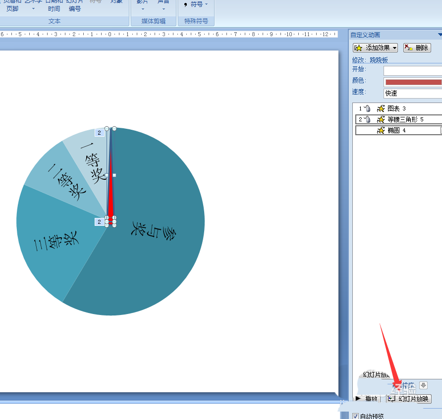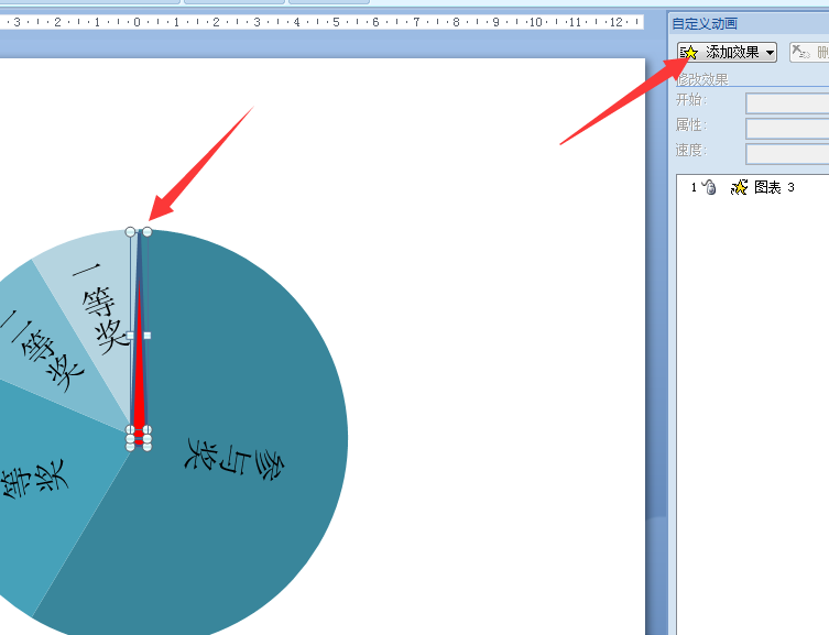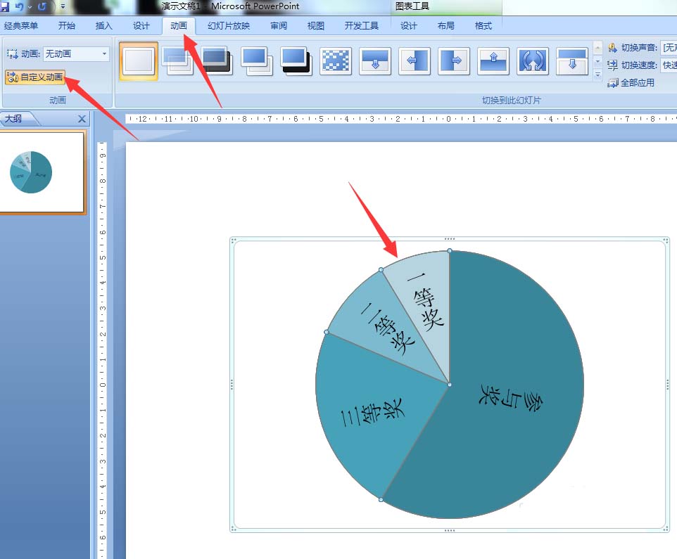 6、例如下面的图片中,饼图里分别输入了一等奖、二等奖、三等奖和参与奖。文本的位置要自己拖动设置,并旋转文本以适应饼图。文本设置好后,选中饼图,再选择动画,点击自定义动画。