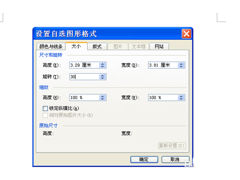 3、切换到大小选项卡,设置旋转角度为30度,点击确定按钮。