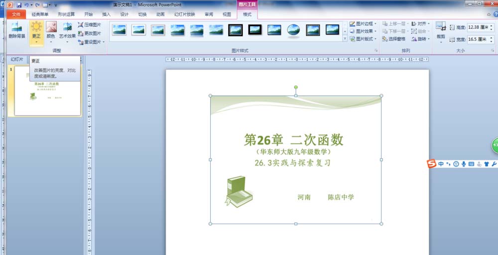 5、为了提高文字的清晰度,在“调整”选项组中单击“更正”按钮。