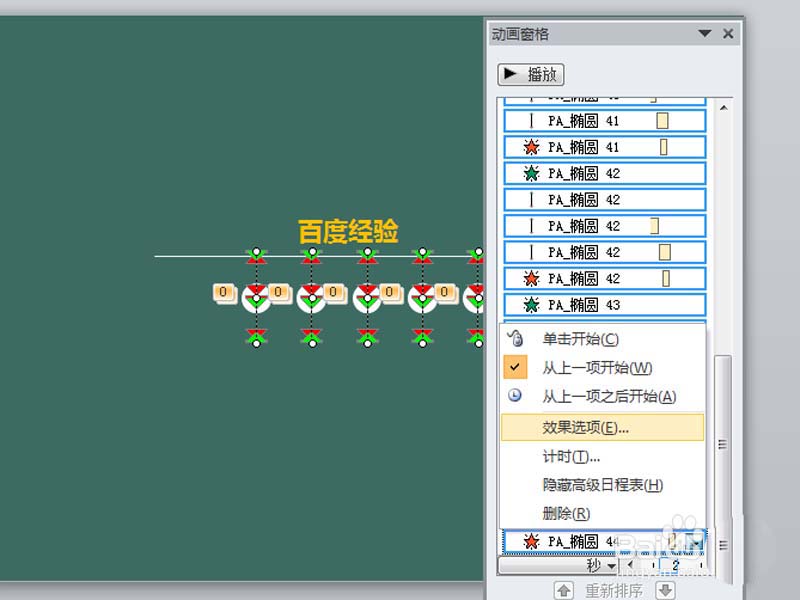 4、调出动画窗格对话框,接着选择所有的动画,调出动画选项。
