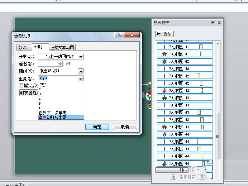 5、切换到计时选项卡,设置期间为中速2秒,重复为直到幻灯片末尾,点击确定按钮。