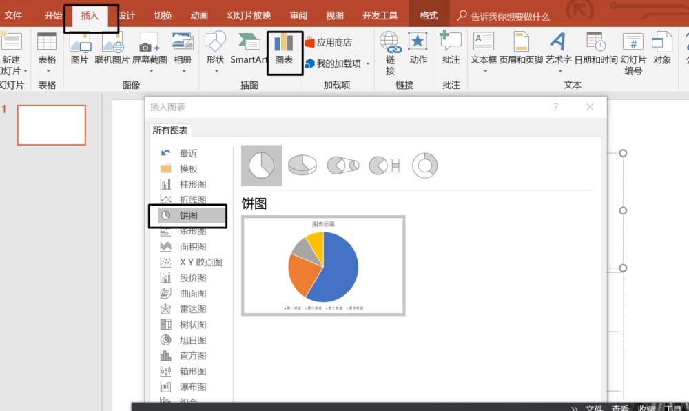 2、鼠标点击幻灯片的某个位置,然后将ppt切换到功能区的插入选项卡状态,点击插图组内的图表按钮,然后在弹出的弹框中选择饼图选项,在ppt中插入一个饼图。
