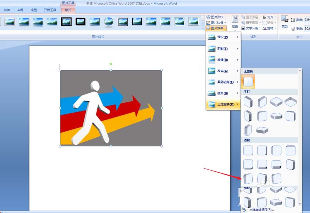 3、在“图片效果”的下拉菜单中,我们点击选择“三维旋转”下的自己需要的格式。