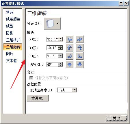 6、在打开的“设置图片格式”中进行透视、距地面高度等的设置。