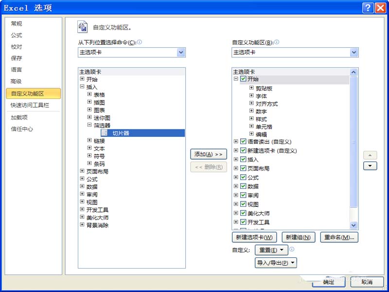 2、在excel选项对话框中,切换到自定义功能区选项。