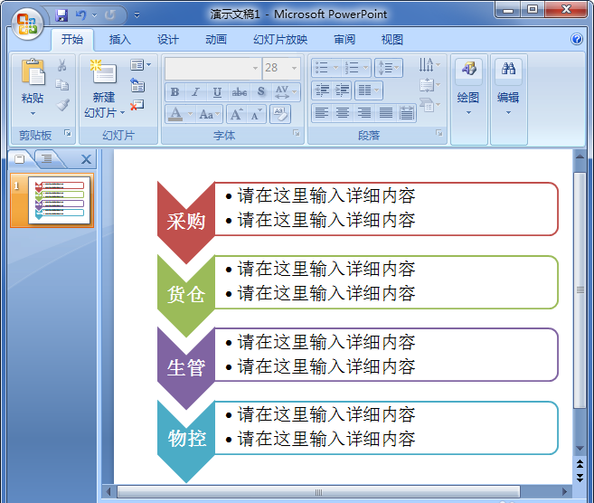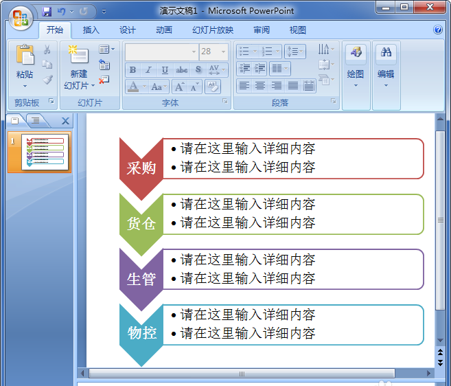 6、最后,分别在每一个图形上输入主标题和内容,标题字体加粗28号填充白色,后面内空的文字默认黑色即可。