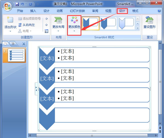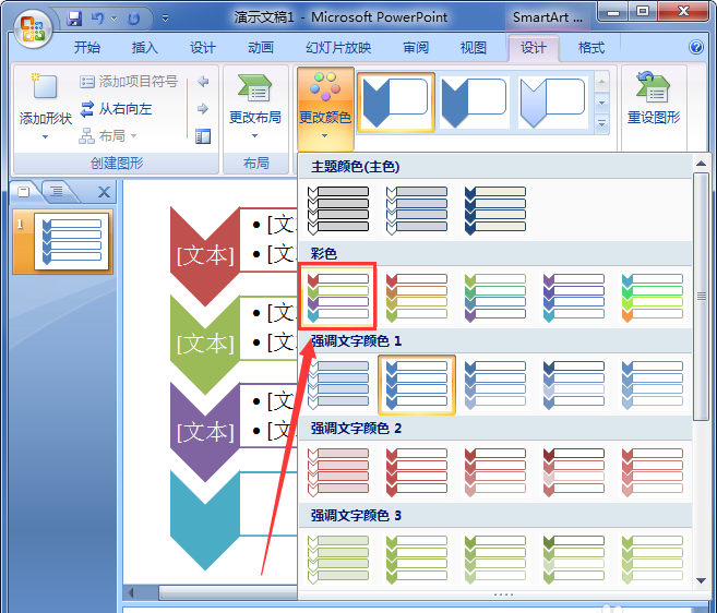 4、选中已插入的垂直V形图形,在设计里面给它填更改一下颜色。