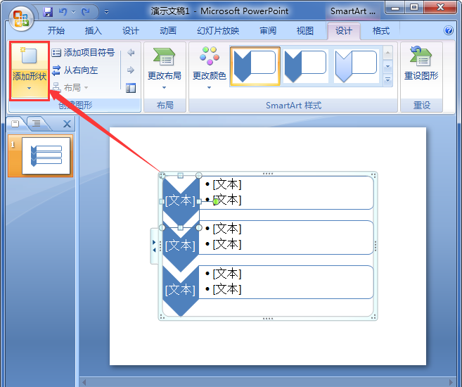 3、系统默认的垂直V形列表3个图形已经自动插入到文档中了,这次制作需要用到4个,所以我们需在左上角处再添加一个形状。
