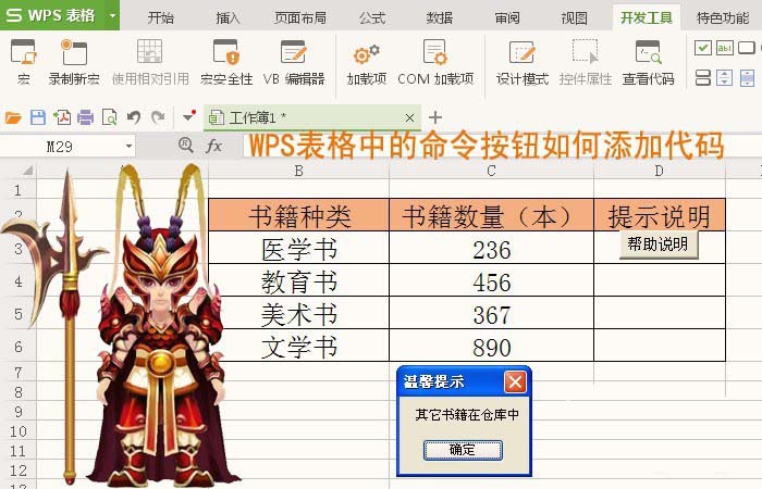 8、最后,鼠标左键单击命令按钮,会弹出一个消息提示窗口。这说明代码添加成功了。这样在WPS表格中就添加好命令按钮的代码了。