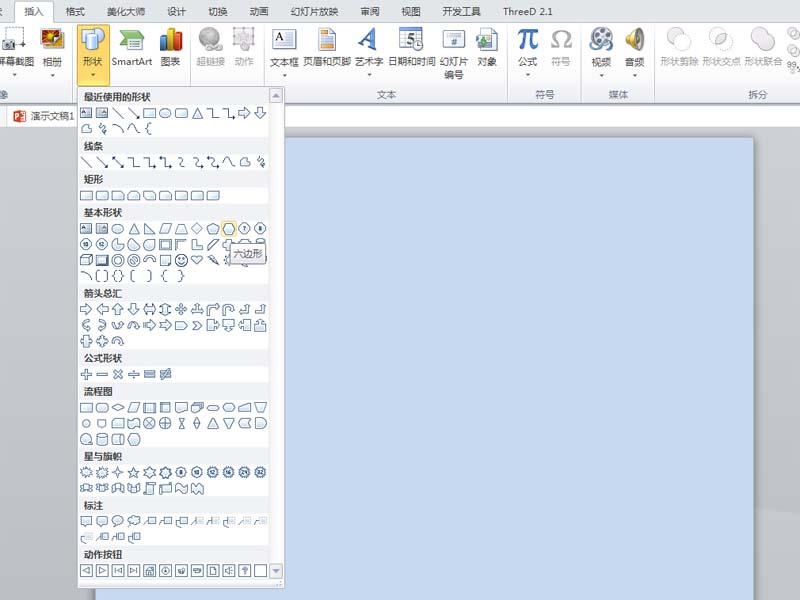 2、执行插入-形状-六边形命令,在页面上按住shift键绘制一个正六边形。