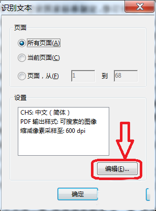 3、在弹出的“识别文本”对话框中,点击“编辑”进行文字识别参数的设置。