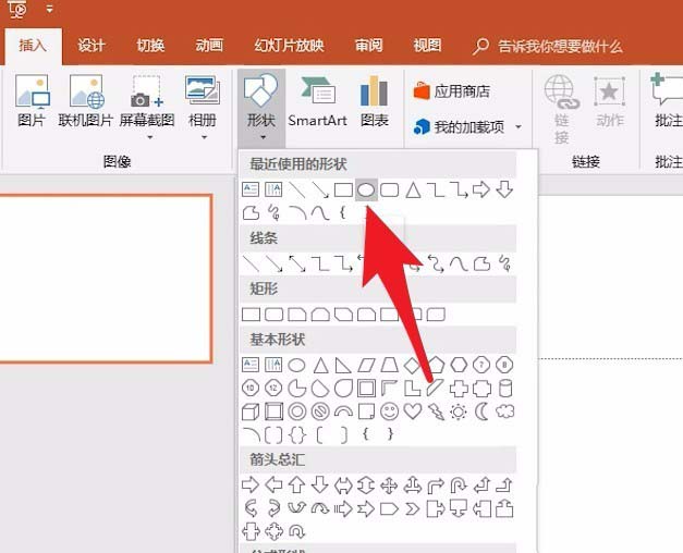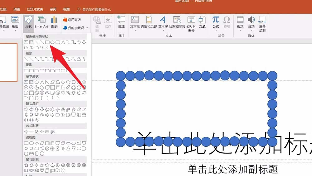 4、在幻灯片画布中绘画的一个圆形连接的矩形形状。然后点击插入形状中的矩形形状。