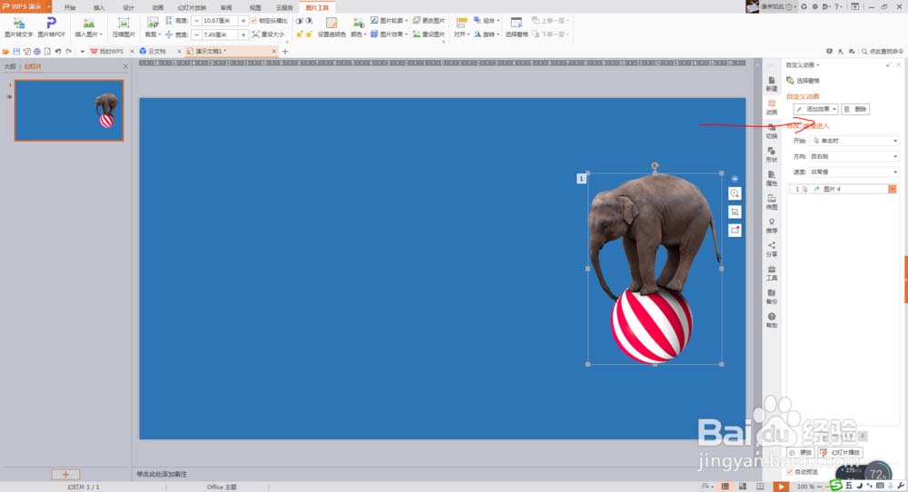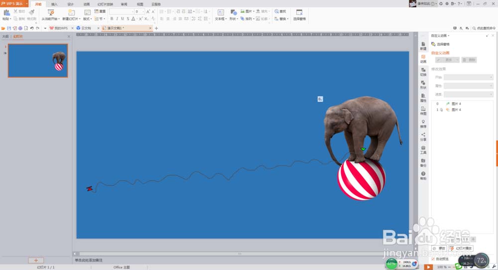 6、测试效果。如果将大象和彩球分别进行动画设置效果会更好。