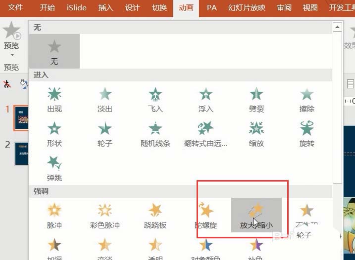 2、然后选中一个图片的话我们点击顶部的动画菜单,选择下拉中的放大缩小选项,如下图所示