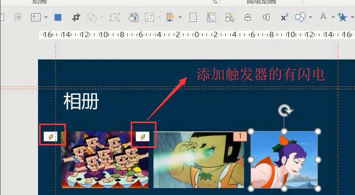 5、回到PPT中,我们就可以看到已经添加了触发器的都会有小闪电图标,如下图所示