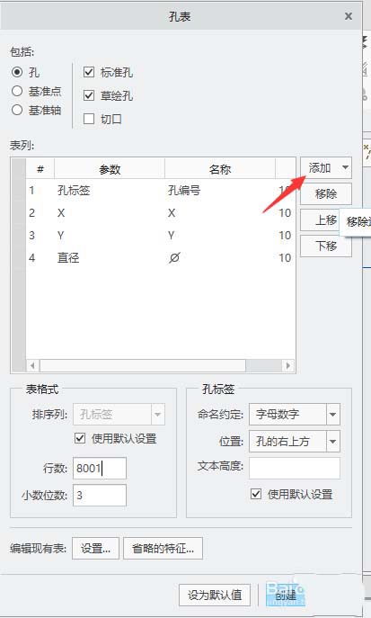 4、在弹出的“孔表”对话框,单击“添加”。