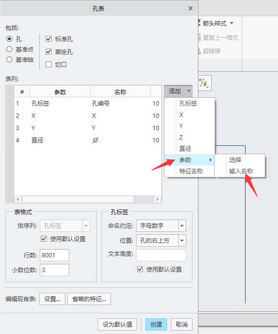 6、在列表区系统自动添加1行,在”参数“列输入”孔深“。按回车键。然后单击”创建“。