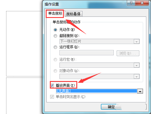 5、在操作设置对话框内我们点击单击鼠标选项,并在其内找到播放声音选项,如图所示: