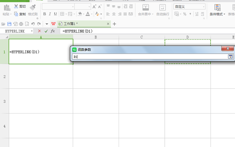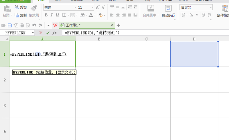 3、在函数参数窗口中,设置链接位置设置为d1,显示文本为跳转到d1.