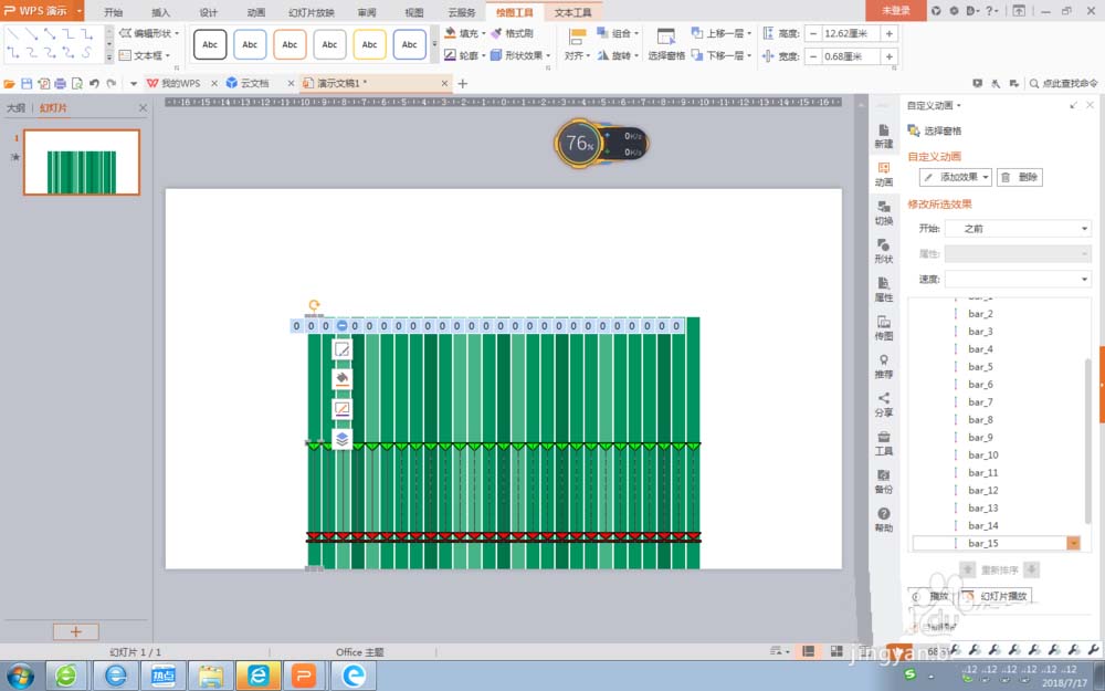 5、为每个“灯柱”设置动画效果。采用“自定义路径”中的直线上下垂直往返。注意设置渐变和不同的速度,使每个灯柱动态呈现有错落感。