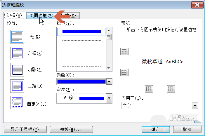 3、在打开的对话框中点击【页面边框】选项卡。