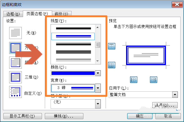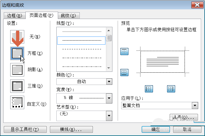 4、点击选择页面边框选项卡左侧的【方框】选项。