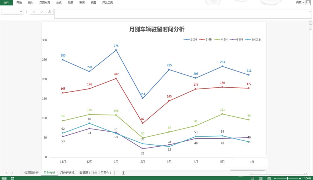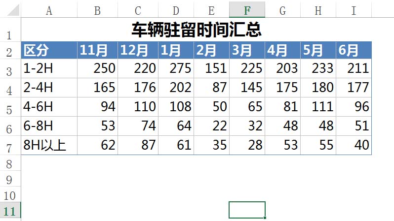 1、下图中是我们的"数据源",我们要制作一个车辆驻留时间分析的图表。