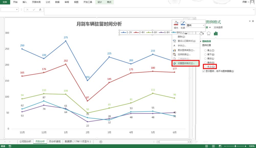 10、我们也可以左键单击选中图例后,然后鼠标右键单击选择"设置图例格式",将位置调整为右上,也可以拖动图例到任何位置。
