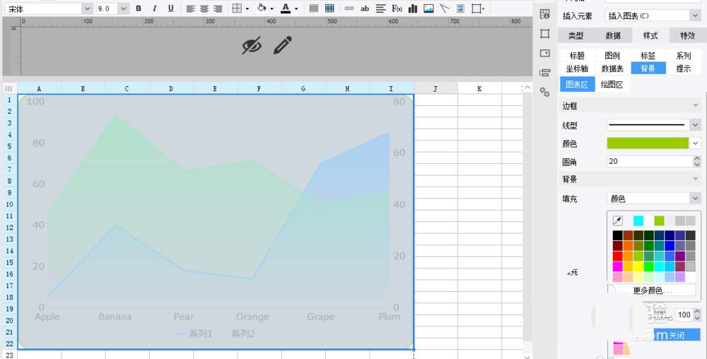 5、接着返回到报表设计器,修改面积图的边框和背景填充颜色,如下图所示: