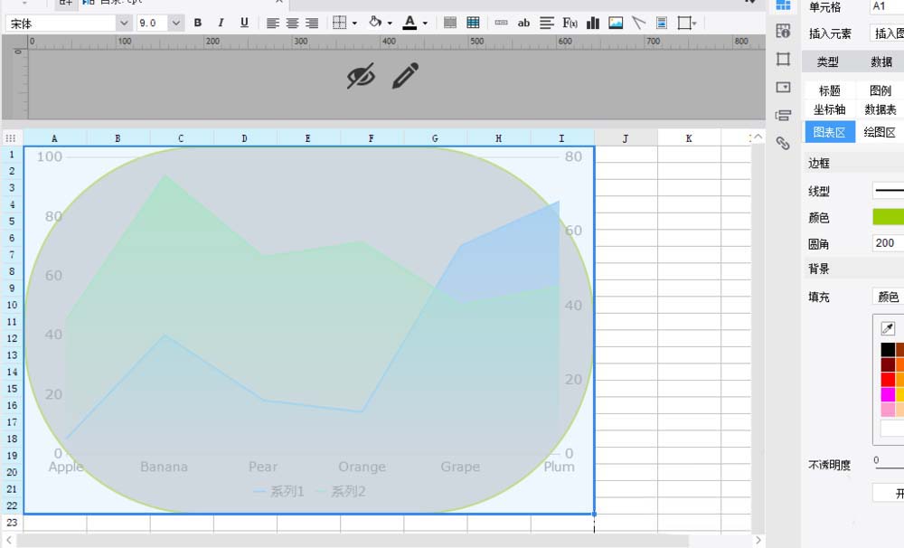 6、将圆角值调整成200,这时可以看到面积图的背景为椭圆形,如下图所示: