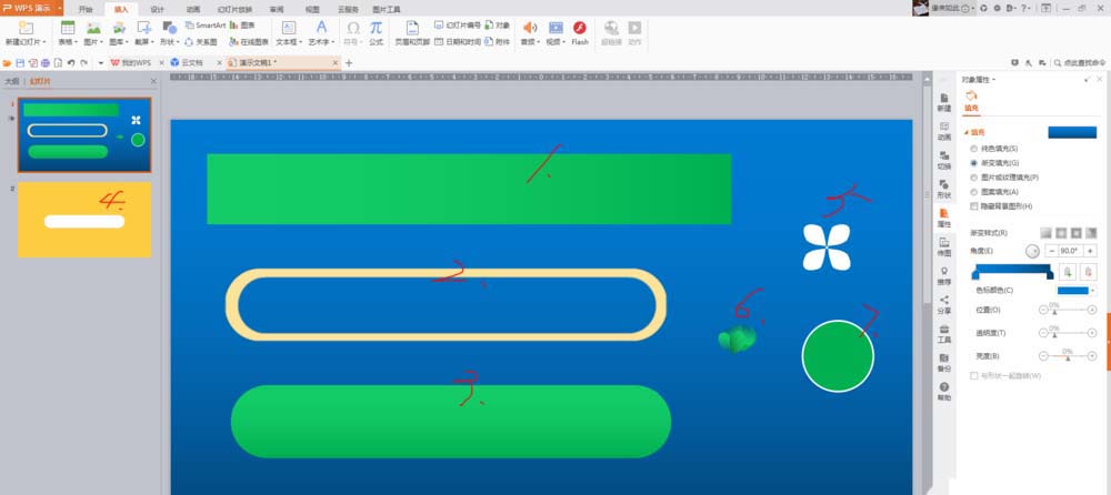 2、插入将要用到的各种“图形”。在基本图形的基础上,根据制作需要进行大小、组合。其中2和4两个图形需要作镂空处理。