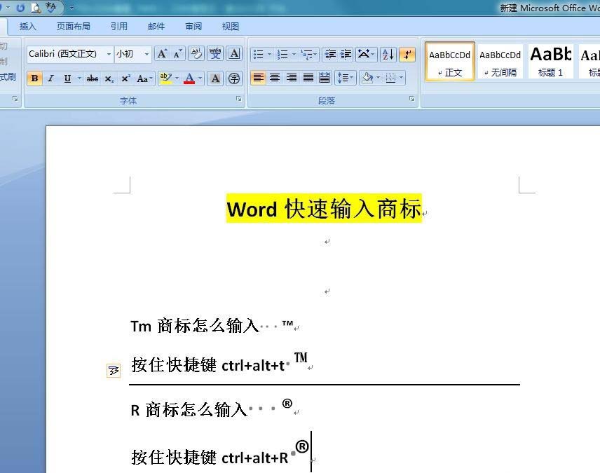 3、我们先试试 TM商标,同时按住ctrl+alt+t,就可以打出商标™