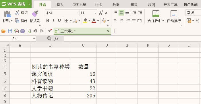 1、打开WPS软件,在表格中创建一个简单的表格,在单元格中的输入数据,比如阅读书籍种类的表格,如下图所示。