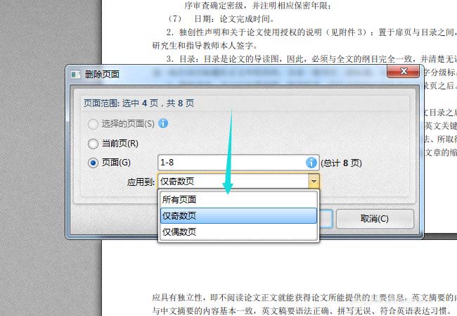 4、范围根据自己需要,应用到选择仅奇数页,然后点击确定就好了,