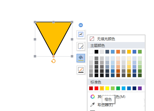 1、使用【形状】——【等腰三角形】画出一个倒三角形,如下图所示,设置填充色为【橙色】,轮廓线为【黑色】。并将【宽度】和【高度】的绝对值均设置为【1.8】。
