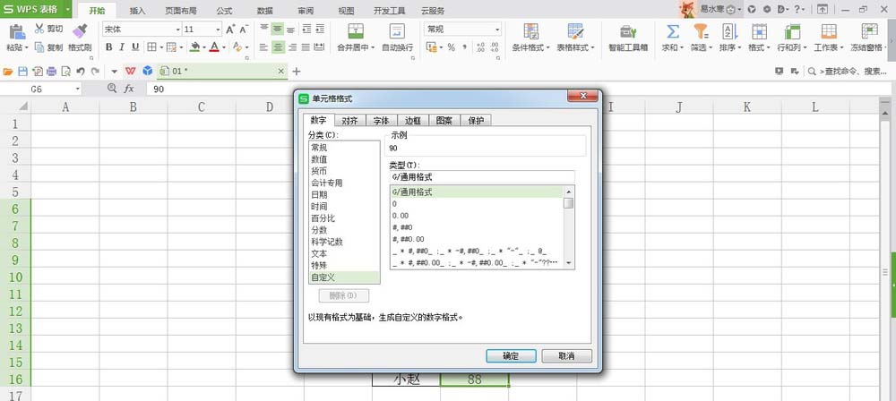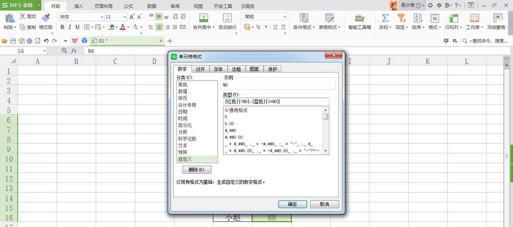 4、输入公式[红色][<90];[蓝色][>=90],该公式含义为数值小于90的显示为红色,大于等于90的显示为蓝色;